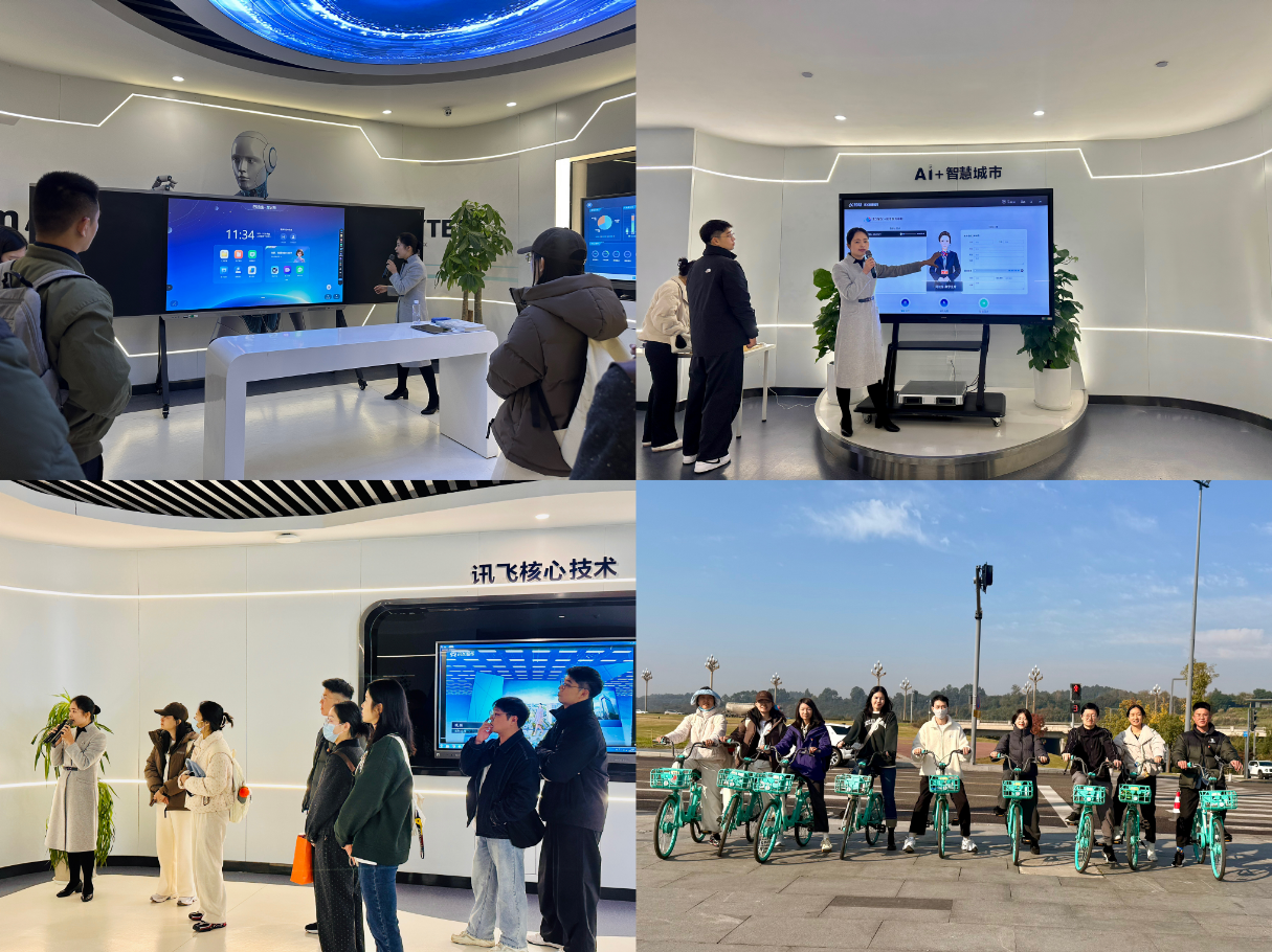 骑行后,大家前往科大讯飞集团进行参观。在人工智能展厅,讲解员详细介绍了科大讯飞在智能语音技术、星火大模型等方面的基本功能和发展前景。博士生也亲自体验了人工智能技术在生活、教育、医疗、城市治理及金融服务等主要场景的应用,切身感受到科研强国、科技报国的重要性。