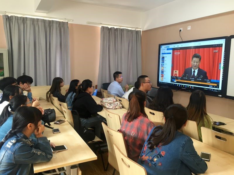 10月18日上午9:00,学院党政班子成员、党委委员、党支部书记、教师代表、学生代表等50余人在我院311会议室集中收看十九大开幕盛况,认真聆听了习总书记所作的报告。学院师生员工还在办公室、教室、活动室、寝室等多个场所通过电视、网络等多种渠道认真收看收听十九大盛况。