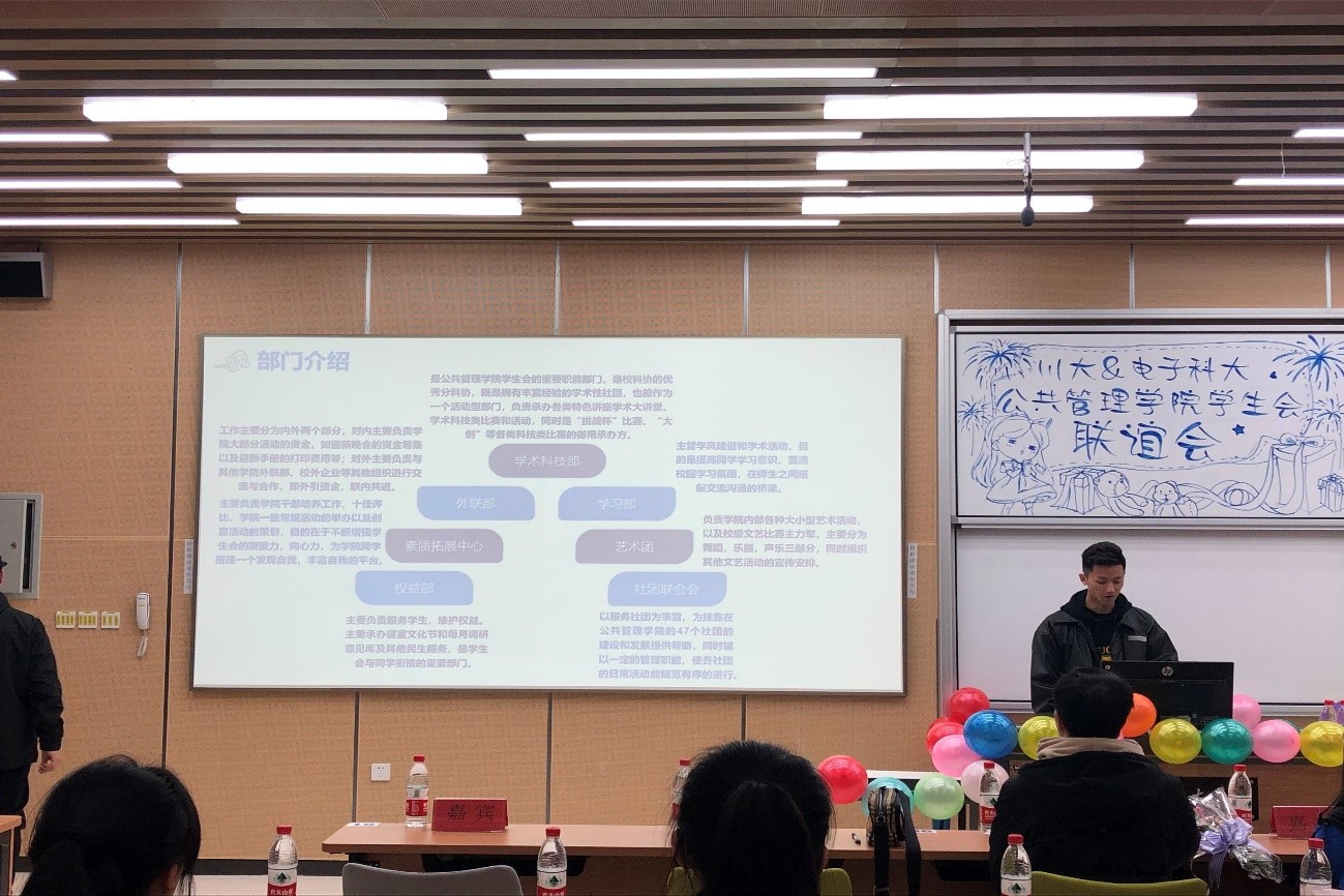 为增强校际友谊,同时为电子科技大学和四川大学的同学提供交流学习的平台,2019年12月1日下午,由best365中国官方网站团委学生会主办的四川大学best365中国官方网站与电子科技大学best365中国官方网站交流联谊活动在四川大学江安校区综合楼C103顺利开展。学院分团委副书记刘冬锐同学、院团委学生会主席王际州同学、电子科技大学best365中国官方网站团委副书记孙琳瑛元同学、电子科技大学best365中国官方网站学生会主席崔振鑫同学以及两校团委学生会各部门代表共80名同学参加了此次活动。