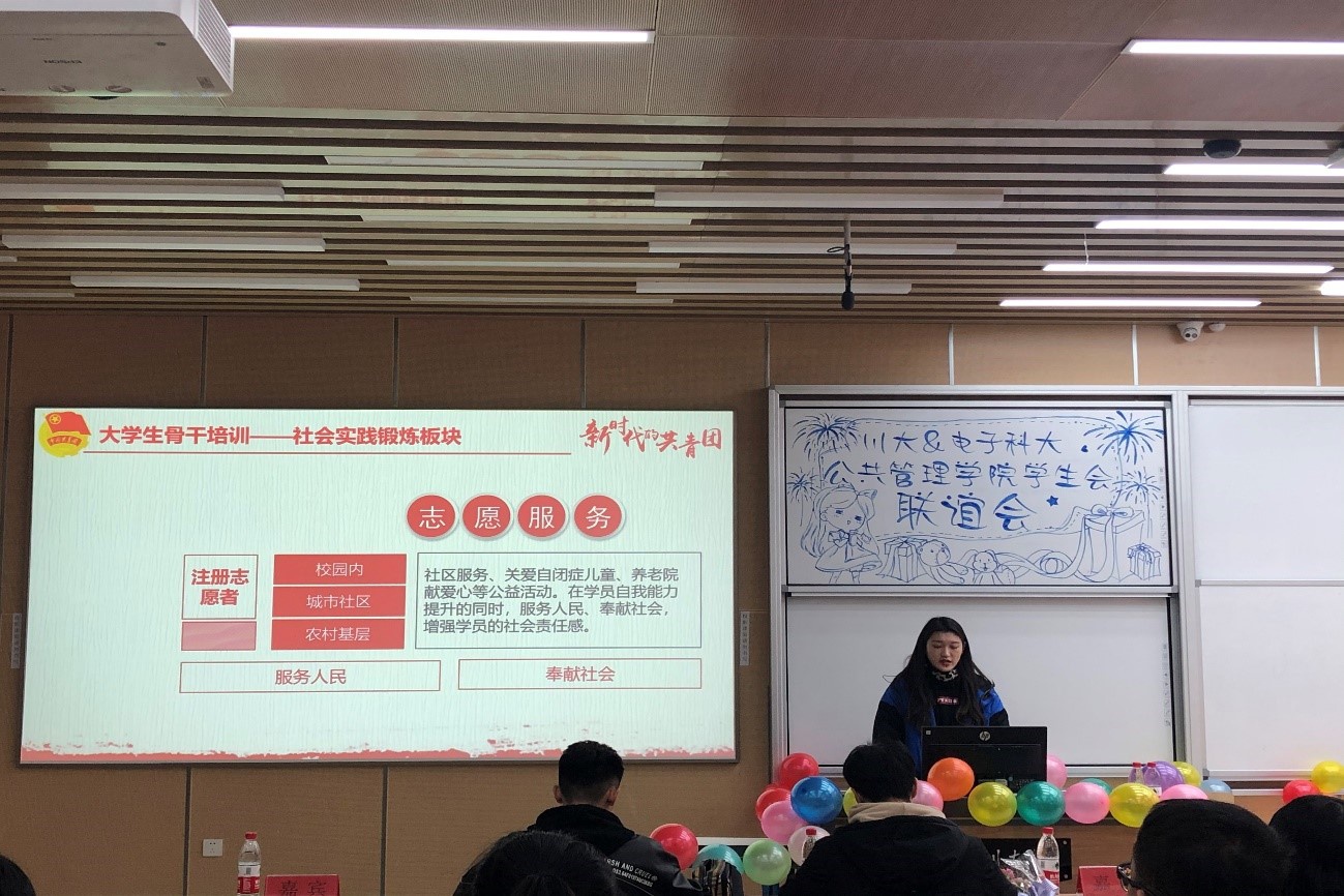 活动伊始,学院的同学们作为东道主热情欢迎了电子科技大学best365中国官方网站同学们的到来。在主持人介绍了到场嘉宾和活动流程后,活动正式开始。首先,由我院团委学生会主席王际州同学发言,他对电子科技大学的同学表示热烈欢迎,并介绍了我院学生会的组织概况,展示了我院的学生活动风采以及在社会服务工作、特色创新工作方面做出的成果。王际州同学表示,“三人行,必有我师焉”,希望通过此两院的交流,促进两院学生工作蒸蒸日上,友谊地久天长。