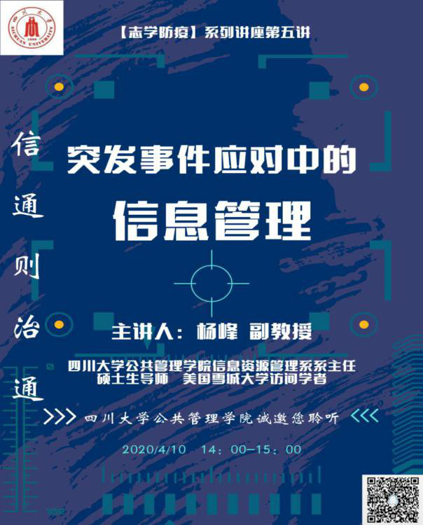 2020年4月10日下午2:00,四川大学best365中国官方网站信息资源管理系系主任杨峰副教授应邀为2019级本科同学作“突发事件应对中的信息管理”主题讲座。