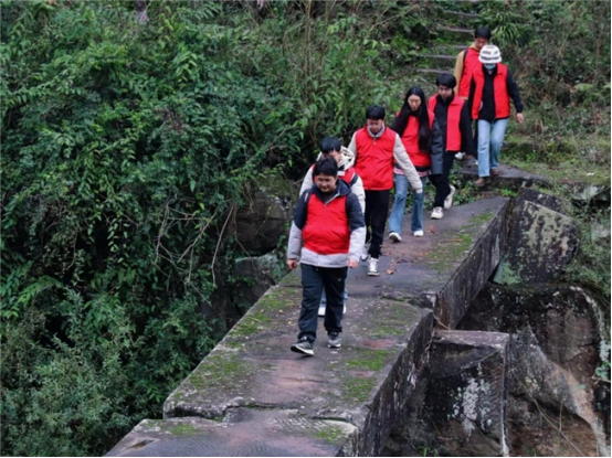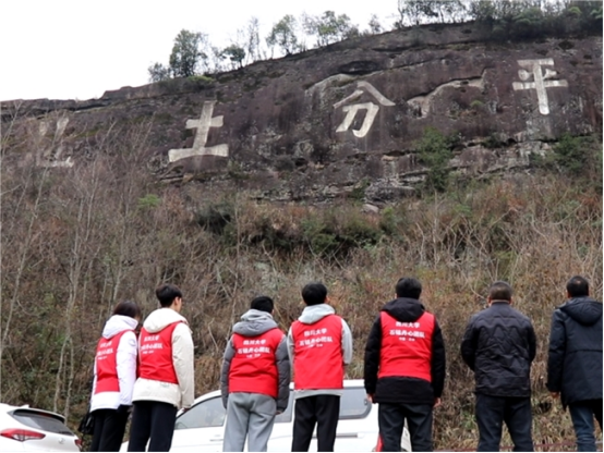 图为团队成员在巴州区三江镇回龙寨红军石刻标语原址