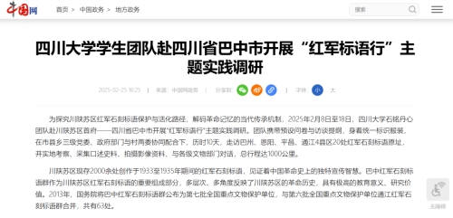 1. 四川大学学生团队赴四川省巴中市开展“红军标语行”主题实践调研 2. 我院学生团队寒假社会实践获中国网、中国日报报道 |