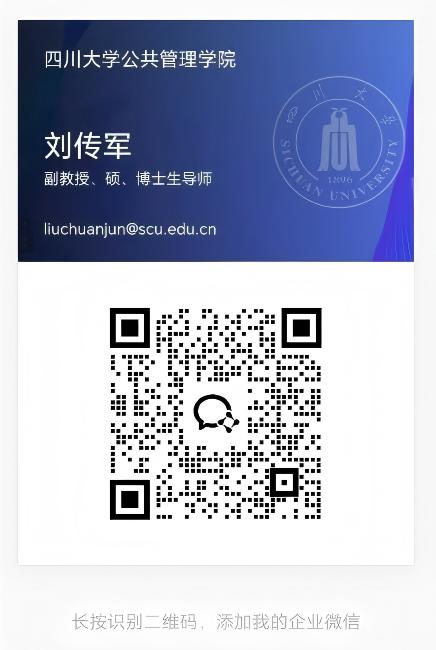 Associate Professor Chuanjun Liu graduated from the Department of Philosophy of Nanjing University in 2011 with a Bachelor's Degree in Philosophy. He voluntarily taught at the Second High School of Jianshui County, Yunnan Province during the academic year of 2011-2012. He pursued a Master's Degree of Science in Basic Psychology and obtained Master's Degree of Education in the Department of Psychology, School of Social and Behavioral Sciences of Nanjing University during the academic year of 2012-2014. He served as a teaching assistant and a lecturer in the School of Law of Southwest University of Science and Technology (SWUST) during the academic years of 2014-2017, lecturing on cognitive psychology, introduction to social psychology and other courses. From 2017-2020, he studied for a doctoral degree in sociology (in the direction of social psychology) at the Department of Psychology, School of Social Sciences, Tsinghua University, and received a PhD degree in law. In August 2020, he joined the School of Public Administration, Sichuan University, where he has served as a specially-appointed associate researcher (August 2020 to August 2023), an Associate Professor (from September 2023 to the present), Supervisor of Master's Degree Program (from March 2021 to the present) and Supervisor of Doctoral Program (from July 2024 to the present).